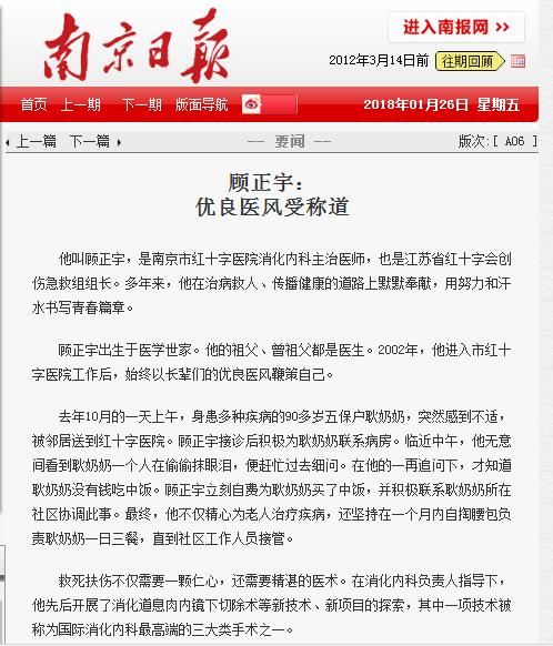 去年10月的一天上午,身患多种疾病的90多岁五保户耿奶奶,突然感到不适,被邻居送到红十字医院。顾正宇接诊后积极为耿奶奶联系病房。临近中午,他无意间看到耿奶奶一个人在偷偷抹眼泪,便赶忙过去细问。在他的一再追问下,才知道耿奶奶没有钱吃中饭。顾正宇立刻自费为耿奶奶买了中饭,并积极联系耿奶奶所在社区协调此事。最终,他不仅精心为老人治疗疾病,还坚持在一个月内自掏腰包负责耿奶奶一日三餐,直到社区工作人员接管。
