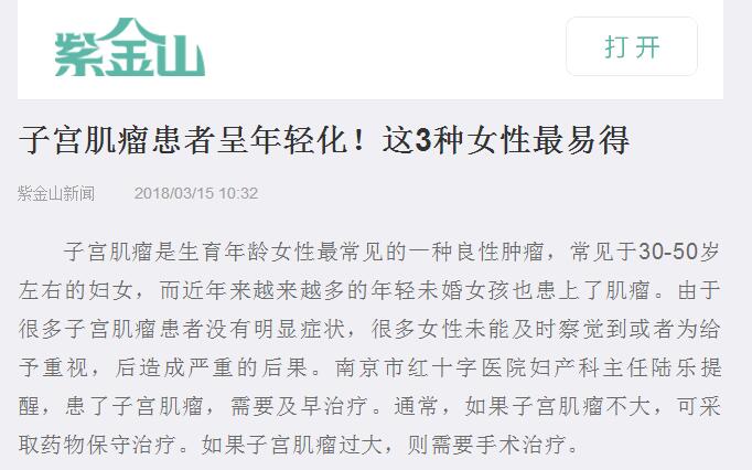 子宫肌瘤是生育年龄女性最常见的一种良性肿瘤,常见于30-50岁左右的妇女,而近年来越来越多的年轻未婚女孩也患上了肌瘤。由于很多子宫肌瘤患者没有明显症状,很多女性未能及时察觉到或者为给予重视,后造成严重的后果。南京市红十字医院妇产科主任陆乐提醒,患了子宫肌瘤,需要及早治疗。通常,如果子宫肌瘤不大,可采取药物保守治疗。如果子宫肌瘤过大,则需要手术治疗。