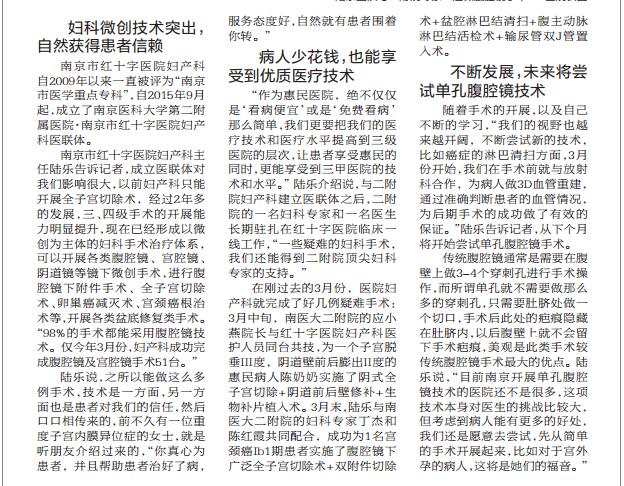 南京市红十字医院妇产科主任陆乐告诉记者,成立医联体对我们影响很大,以前妇产科只能开展全子宫切除术,经过2年多的发展,三、四级手术的开展能力明显提升,现在已经形成以微创为主体的妇科手术治疗体系,可以开展各类腹腔镜、宫腔镜、阴道镜等镜下微创手术,进行腹腔镜下附件手术、全子宫切除术、卵巢癌减灭术、宫颈癌根治术等,开展各类盆底修复类手术。“98%的手术都能采用腹腔镜技术。仅今年3月份,妇产科成功完成腹腔镜及宫腔镜手术51台。”