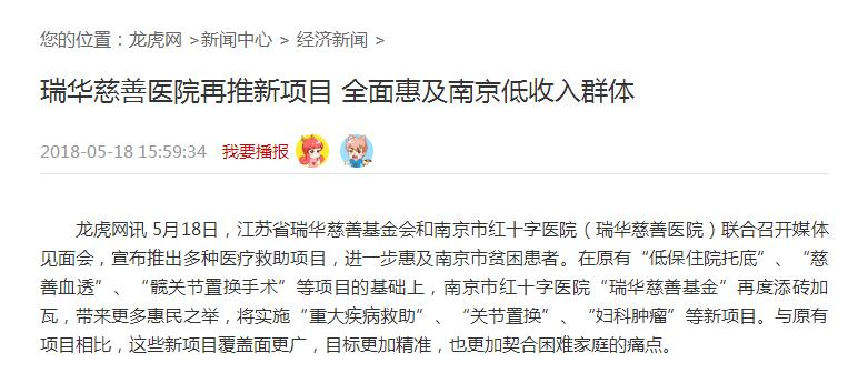 龙虎网讯 5月18日,江苏省瑞华慈善基金会和南京市红十字医院(瑞华慈善医院)联合召开媒体见面会,宣布推出多种医疗救助项目,进一步惠及南京市贫困患者。在原有“低保住院托底”、“慈善血透”、“髋关节置换手术”等项目的基础上,南京市红十字医院“瑞华慈善基金”再度添砖加瓦,带来更多惠民之举,将实施“重大疾病救助”、“关节置换”、“妇科肿瘤”等新项目。与原有项目相比,这些新项目覆盖面更广,目标更加精准,也更加契合困难家庭的痛点。