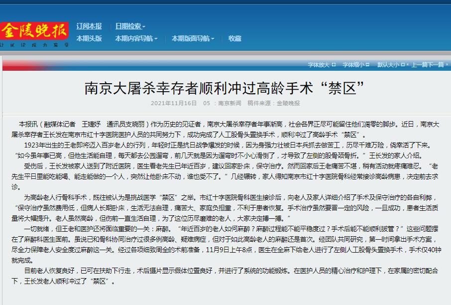 本报讯(融媒体记者 王婕妤 通讯员支晓丽)作为历史的见证者,南京大屠杀幸存者年事渐高,社会各界正尽可能留住他们凋零的脚步。近日,南京大屠杀幸存者王长发在南京市红十字医院医护人员的共同努力下,成功完成了人工股骨头置换手术,顺利冲过了高龄手术“禁区”。